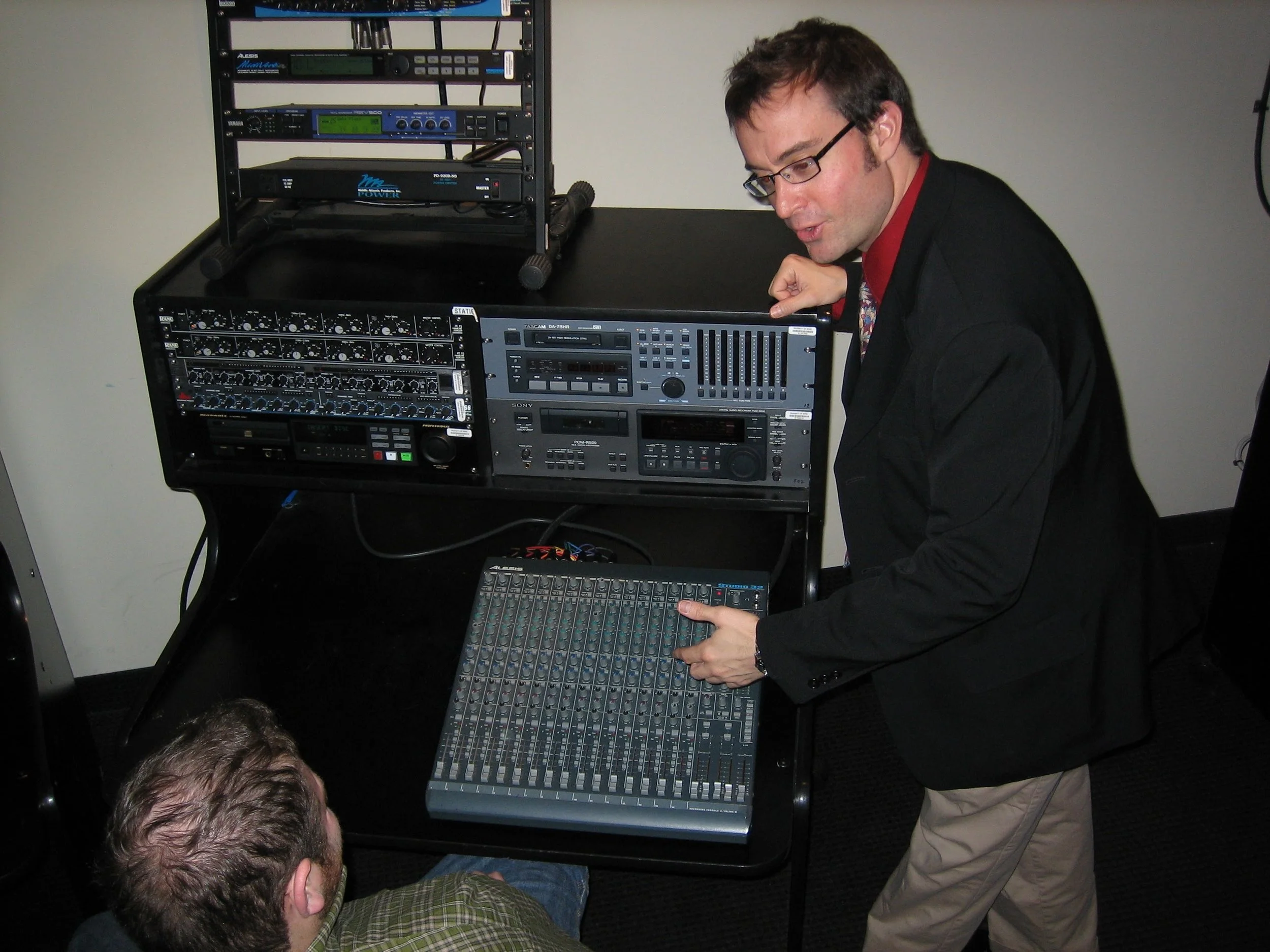 Teaching signal flow with one of the small stations I designed for the college (back when “rewind” was still a thing).